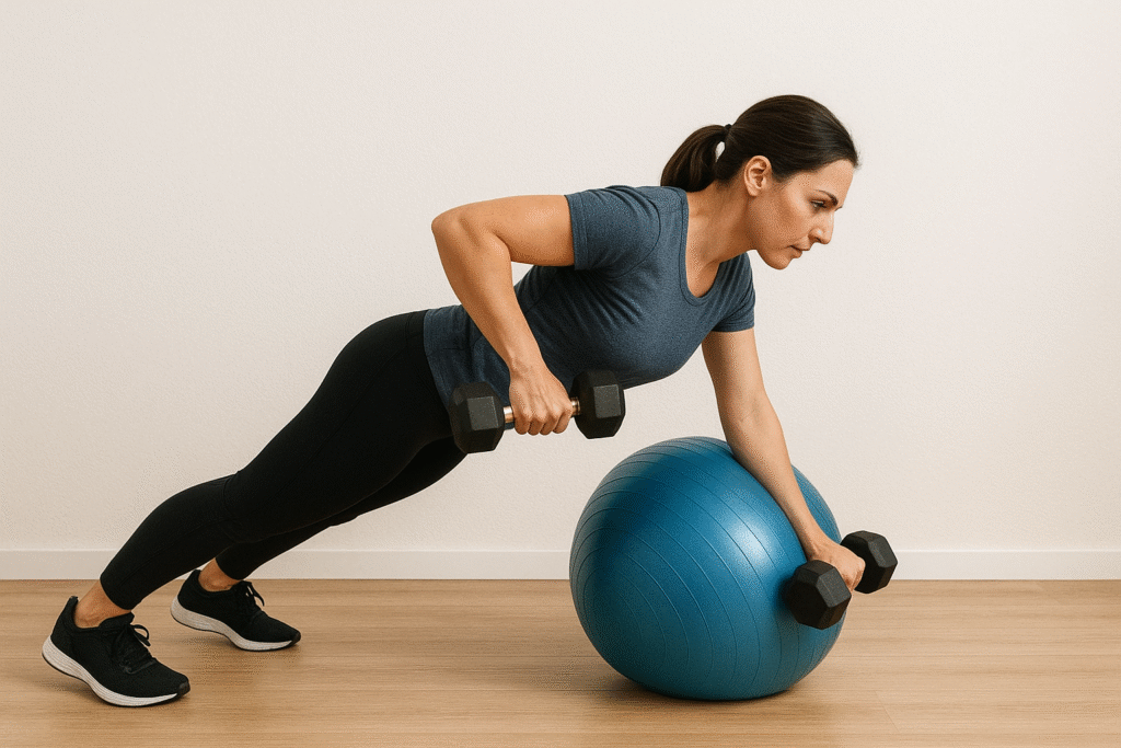 Tip final: Incrementa dificultad usando fitball más pequeña para inestabilidad o añadiendo peso ligero, siempre manteniendo abdomen activo durante todos los ejercicios.