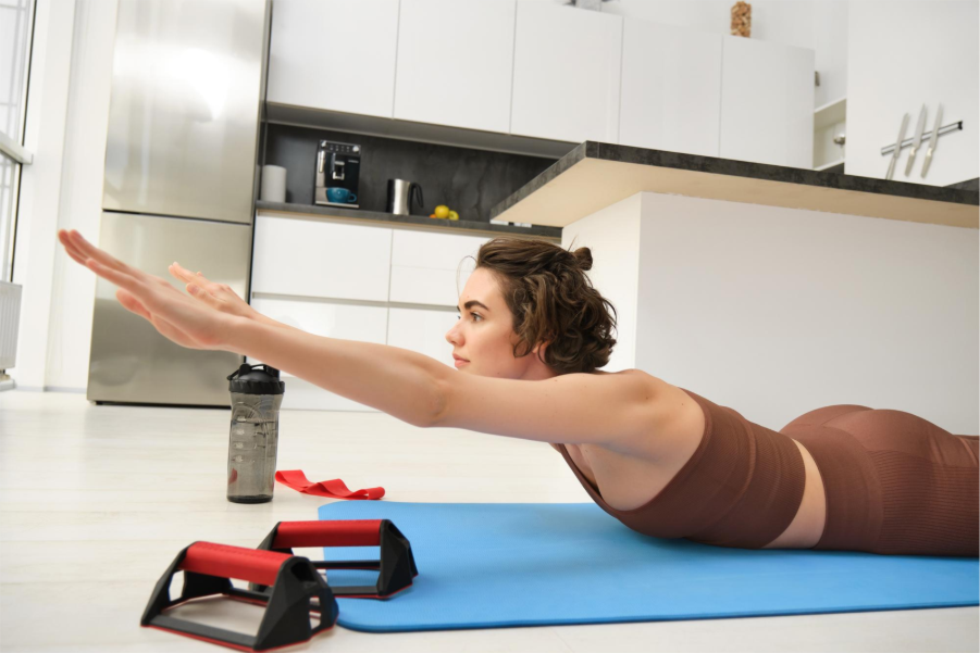 - Eleva brazos, pecho y piernas al mismo tiempo manteniendo el abdomen en el suelo.